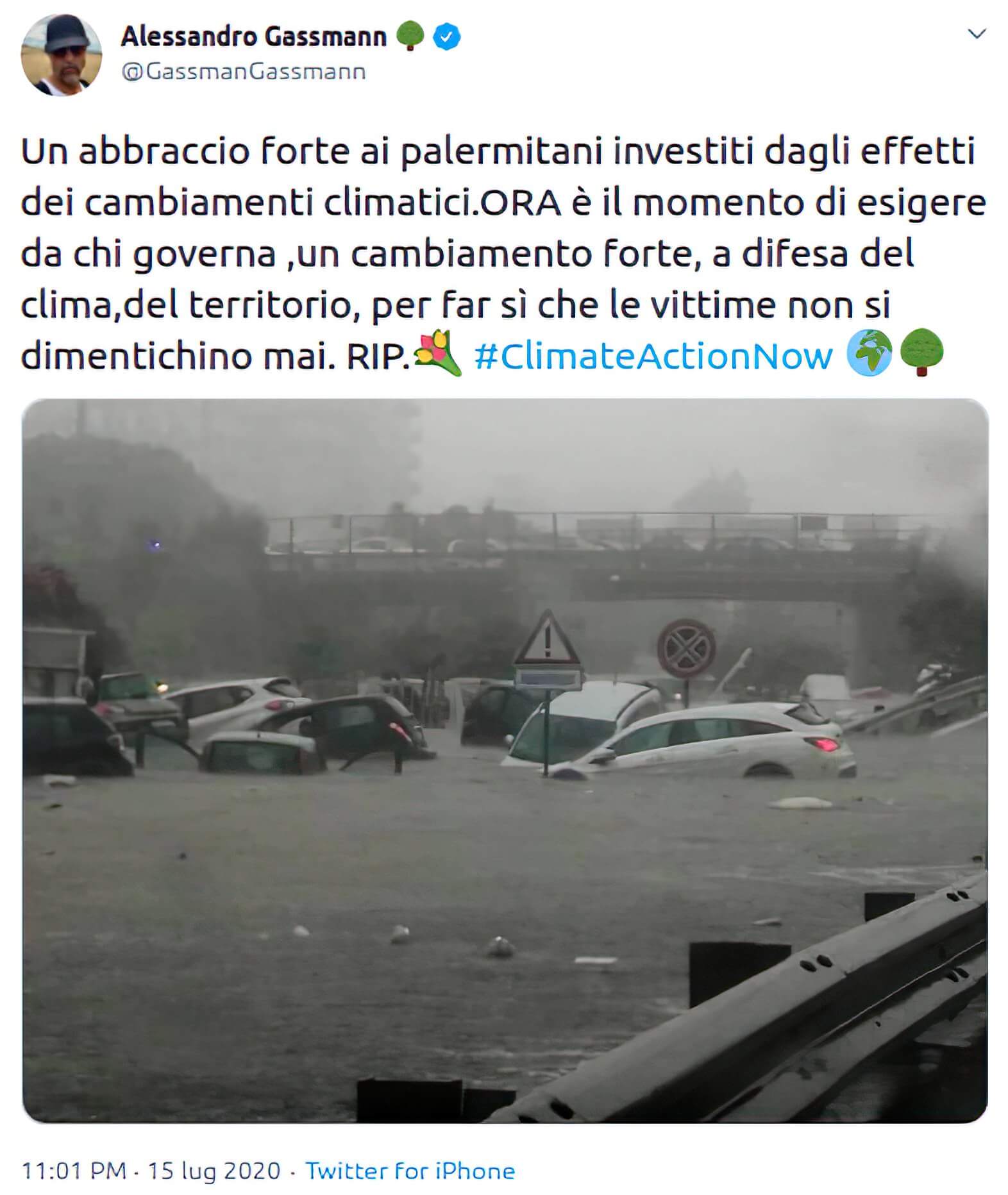Un altro messaggio per Palermo è arrivato da Alessandro Gassmann, che su Twitter ha scritto un messaggio facendo riferimento alle lotte ambientaliste contro il cambiamento climatico: “Un abbraccio forte ai palermitani investiti dagli effetti dei cambiamenti climatici. ORA è il momento di esigere da chi governa, un cambiamento forte, a difesa del clima, del territorio, per far sì che le vittime non si dimentichino mai. RIP”.