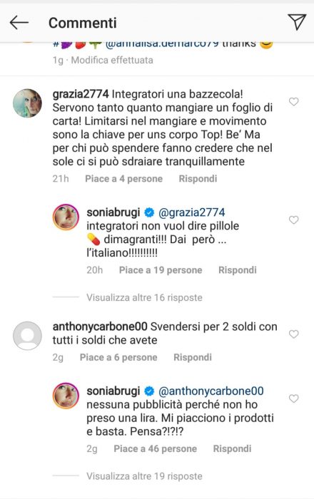 Ad un follower che si meravigliava del fatto che Sonia Bruganelli si mettesse a pubblicizzare prodotti su Instagram, l’imprenditrice ha risposto che non si tratta di pubblicità e che lei non è stata pagata, ma che utilizza i prodotti e le piacciono. Poco sopra aveva chiarito che si tratta di integratori e non di pillole dimagranti.