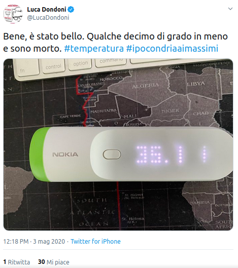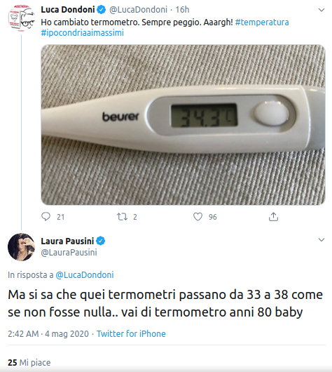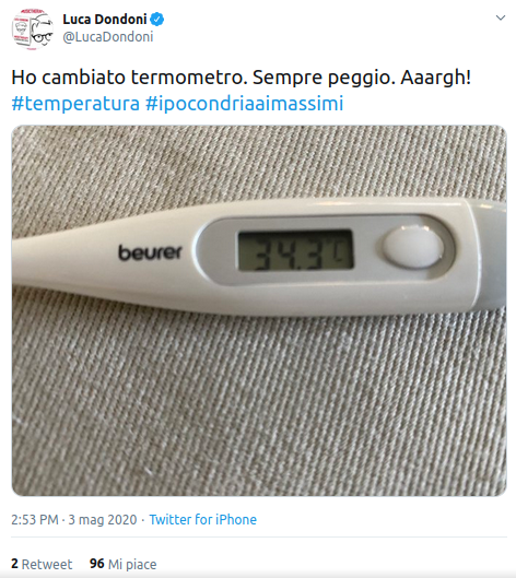 Andiamo con ordine. Forse preso da un po’ d’ipocondria, Luca Dondoni, giornalista de La Stampa e voce di RTL 102.5, ha fatto delle prove su Twitter per verificare se effettivamente i termometri digitali siano affidabili e se funzionano davvero.
