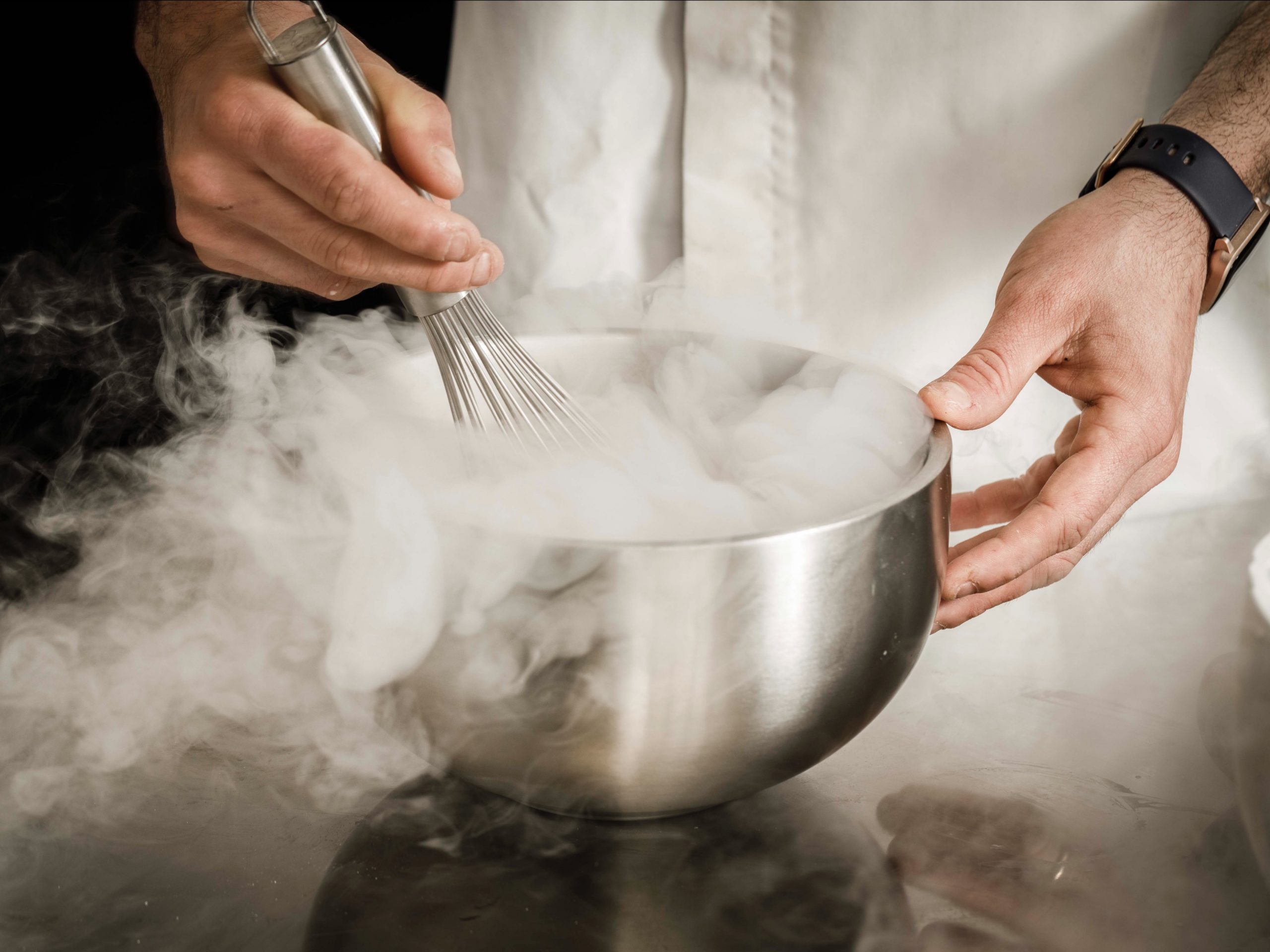 Particolare la ricetta del Tonno arrosto, meringa al barbecue con profumo di agrumi: la meringa, infatti, viene preparata in azoto liquido per mantenere un cuore morbido e il piatto viene adagiato su ghiaccio secco aromatizzato agli agrumi per creare un effetto fumo profumato. L’utilizzo dell’azoto liquido trova ampio campo di applicazione anche nella gelateria come dimostra la preparazione di OOps! Mi è caduto il gelato, un gelato di ultima generazione creato sul momento con azoto liquido dallo chef Paoloni.