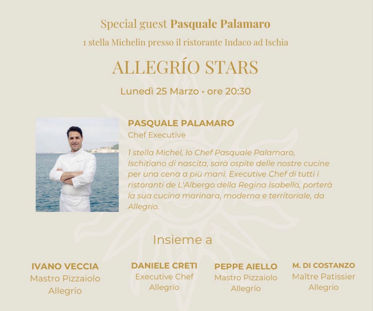 Da qui l’idea di Allegrío Guest Stars: un calendario di eventi che vede l’insegna di Via Veneto al centro del panorama culinario insieme alle GUEST STARS: delle vere e proprie “stelle” della buona cucina.
