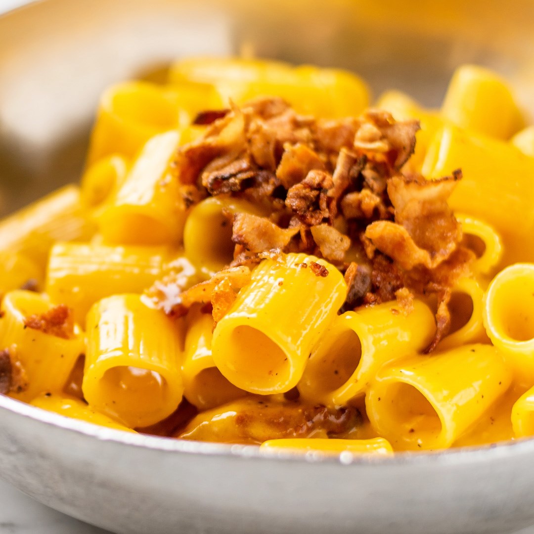 L’anima del carbonaro lascia la sua impronta soprattutto in cucina, dove la ricerca di prodotto è prioritaria: come nelle vecchie osterie, si tratta direttamente con i produttori, spesso piccole realtà a conduzione familiare, scegliendo l’ingrediente migliore. Così ad esempio, il guanciale viene acquistato da Re Norcino, un produttore di Ascoli Piceno che ha vinto numerosi premi e che esiste da oltre 130 anni. Il pecorino lo fornisce Cibaria e racconta una storia di famiglia: prodotto in altura, è molto più dolce degli altri pecorini ma sempre saporito. Il baccalà viene pescato all’amo, cosa che lo preserva dagli ematomi tipici della pesca con la rete. I funghi porcini vengono forniti da un caro amico del cuoco Daniele, che ha un negozio di ortofrutta e che li seleziona personalmente dalle colline laziali. La lonza aromatizzata ai frutti di bosco proviene da una piccolissima realtà tra Lazio e Toscana, dove non usano la corrente elettrica e fanno le cose come una volta, con le candele, il fieno e la paglia. Polpo, gamberi e calamaretti sono di Santo Spirito. E ancora, la mozzarella di bufala affumicata è stata selezionata da una piccola realtà produttiva della zona di Latina.
