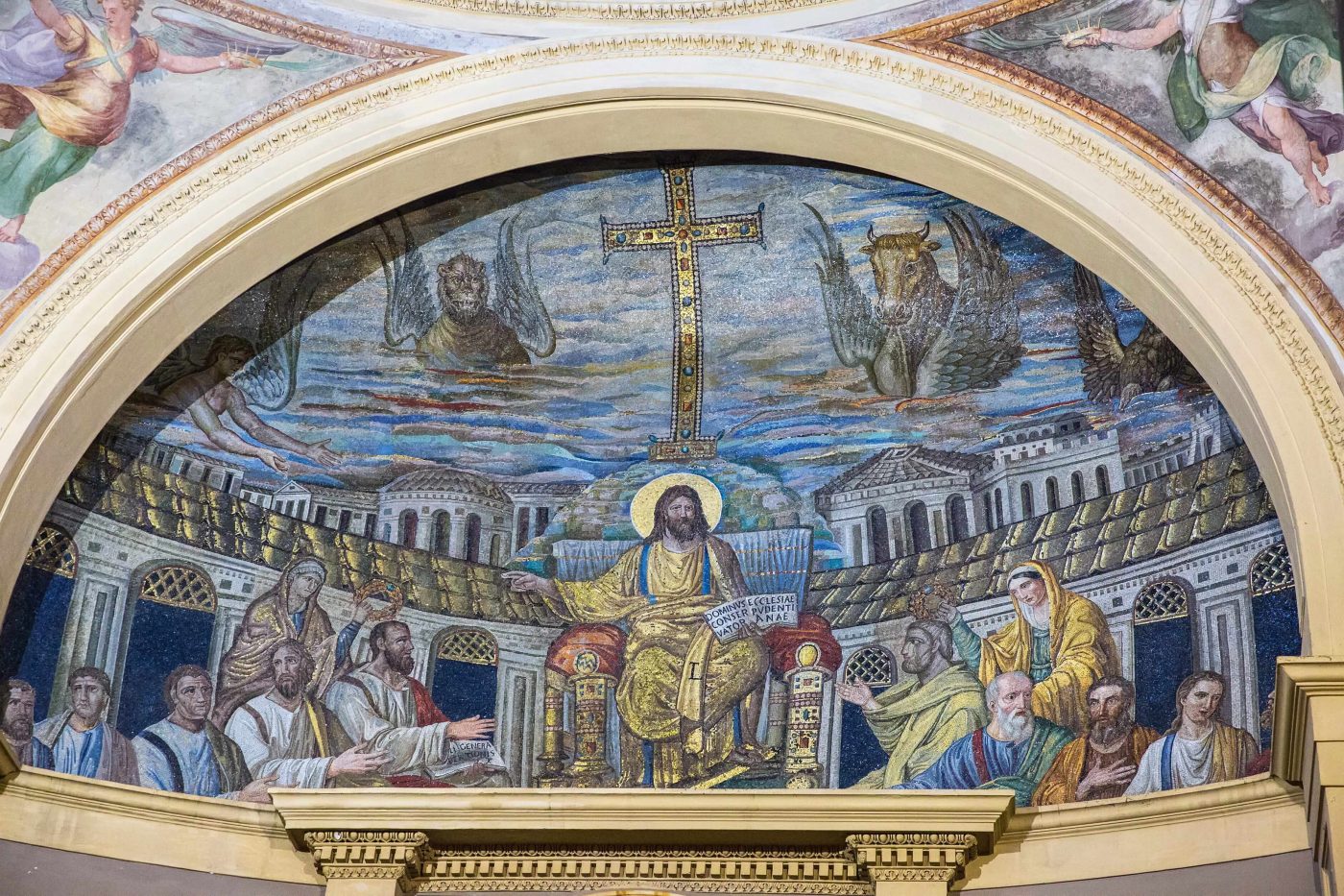 Nel mosaico compaiono anche due figure femminili che porgono una corona: secondo alcuni studiosi rappresentano le sante Pudenziana e Prassede, mentre secondo altri simboleggiano la Chiesa e la Sinagoga. Sullo sfondo appare una città identificata spesso con Gerusalemme, mentre sopra la croce compaiono i quattro simboli degli evangelisti – l’angelo, il bue, il leone e l’aquila – una delle più antiche raffigurazioni monumentali del cosiddetto Tetramorfo.