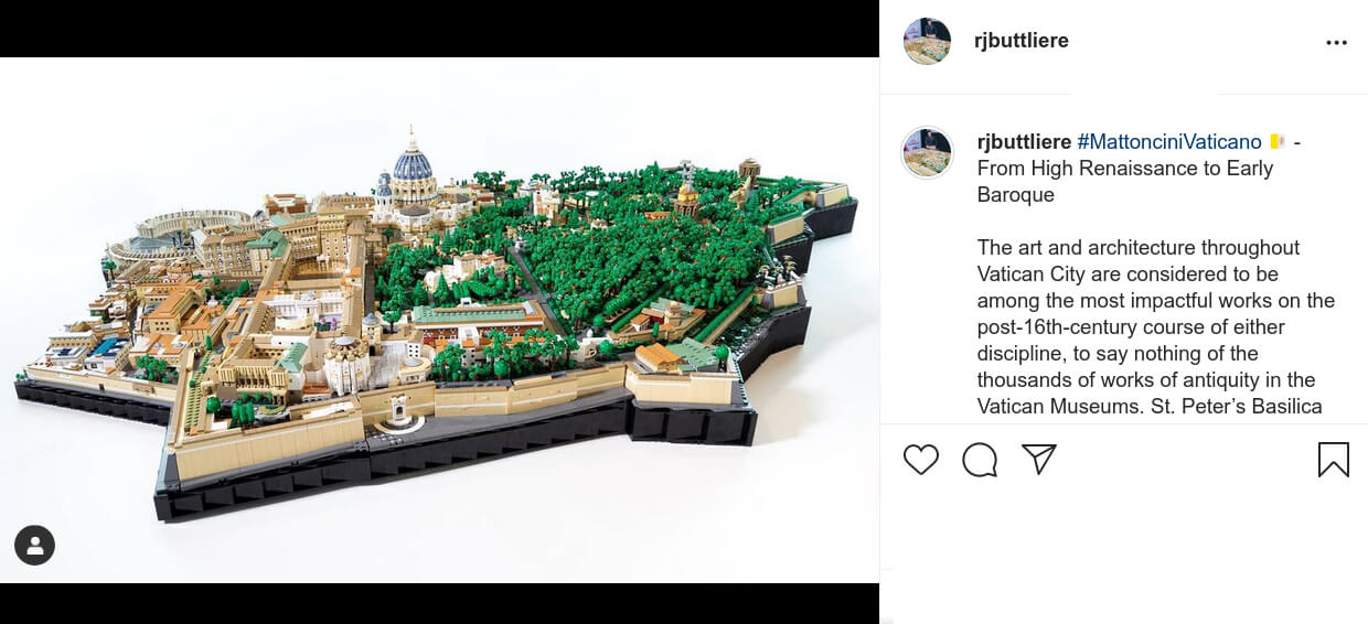 Partiamo dal principio. Rocco Buttliere si autodefinisce un “Lego Artist”. Ed infatti con le sue creazioni riesce ad utilizzare i famosi mattoncini per riproporre alcune delle opere architettoniche più belle di sempre, tra le quali il Colosseo, panorami provenienti dalla Roma Imperiale, o la cattedrale di Santa Maria del Fiore di Firenze. Non a caso, dunque, la sua ultima realizzazione è una splendida riproduzione in mattoncini Lego della Città del Vaticano.