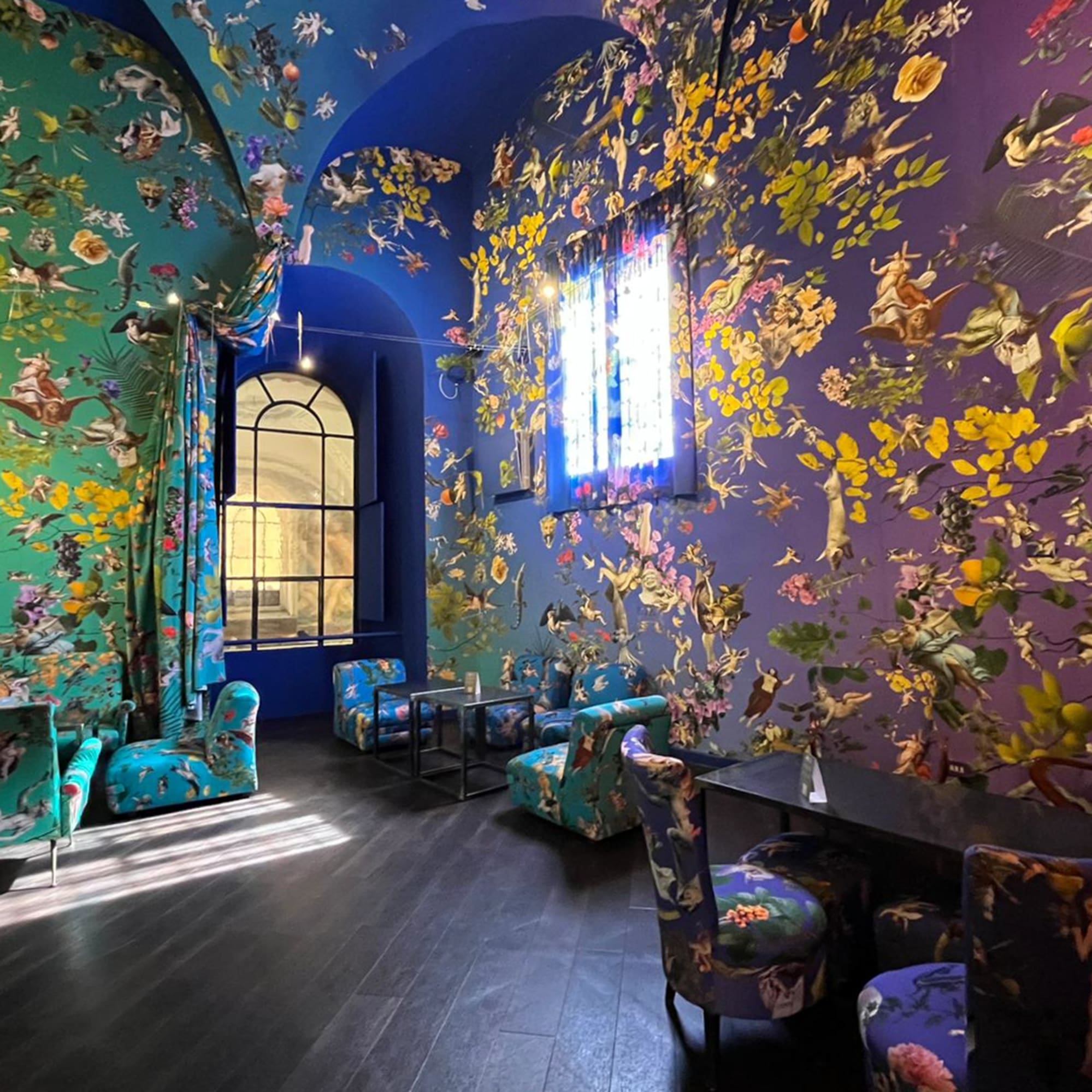 Andiamo con ordine e partiamo dal principio. Nel cuore di Roma, a pochi passi da Piazza Navona, in via della Pace c’è il Chiostro del Bramante. Ed ospita uno spazio in grado di unire ristorazione e arte contemporanea in modo sorprendente: La Sala delle Sibille. Si tratta un ambiente pensato per accogliere colazioni, brunch e pause gourmet all’interno di un’opera site-specific che avvolge completamente lo spazio. L’esperienza sensoriale è totale: pareti, colori e dettagli dialogano con l’architettura storica, creando un equilibrio tra passato e presente che rende ogni visita memorabile.