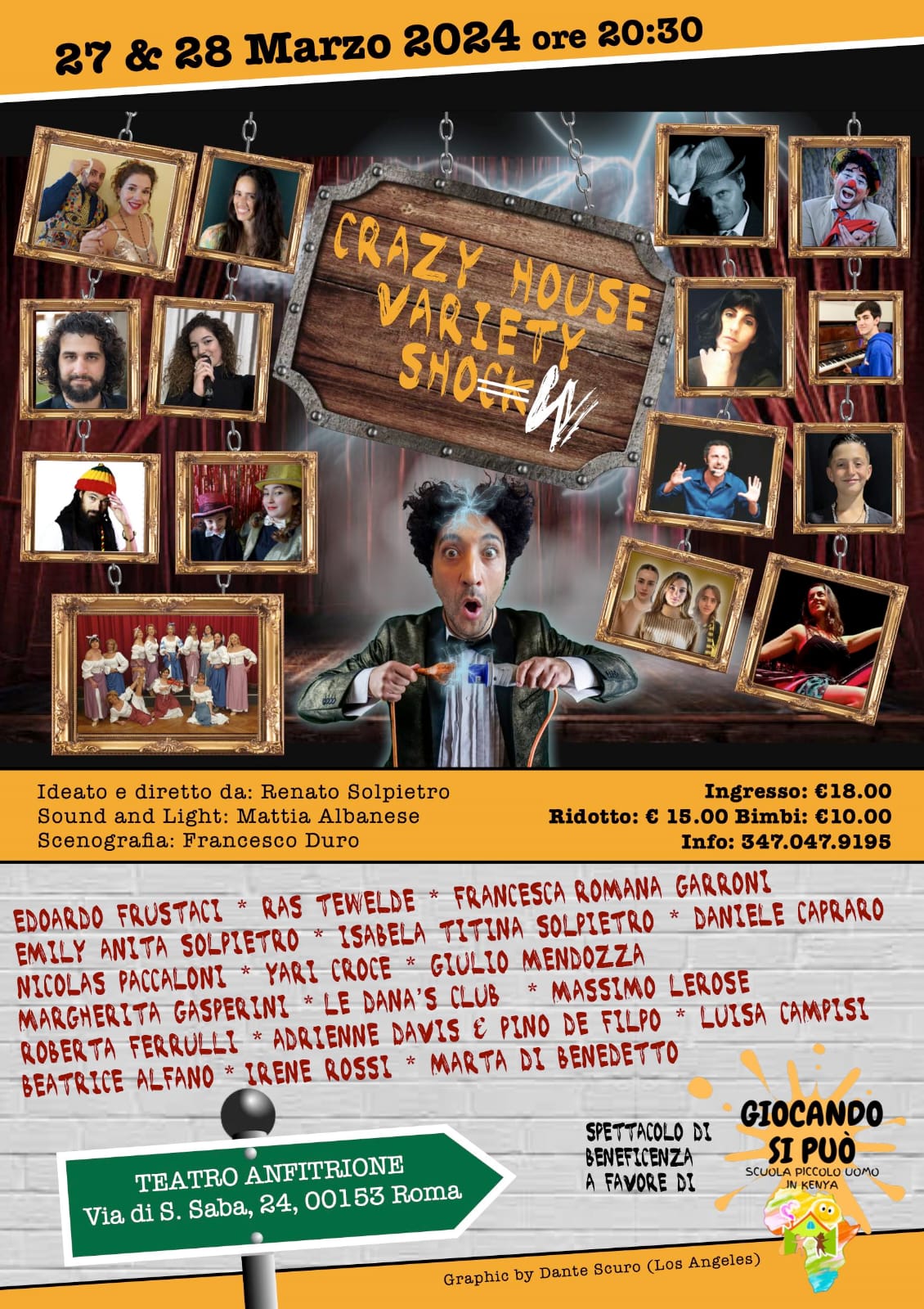 Il 27 e il 28 Marzo 2024 andrà in scena al Teatro Anfitrione, Crazy House Variety Show, spettacolo di beneficienza a favore di Ass. Culturale Giocando si Può per la costruzione di due pozzi d’acqua gratuita a Watamu, in Kenya.