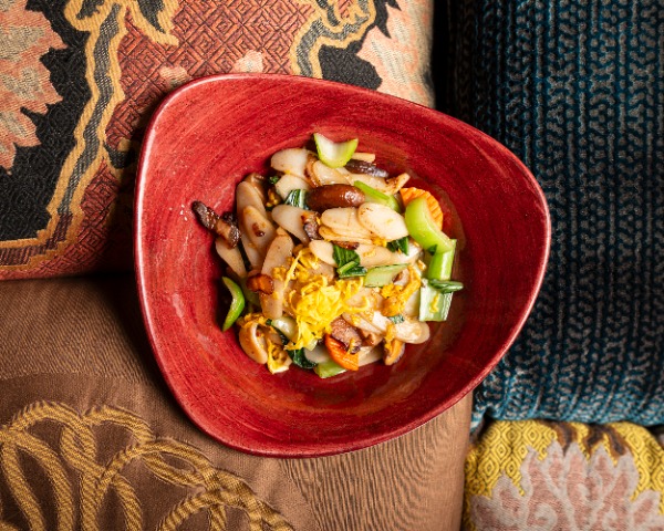 Nian Gao, gnocchi di riso saltati con carote, funghi e maiale marinato.