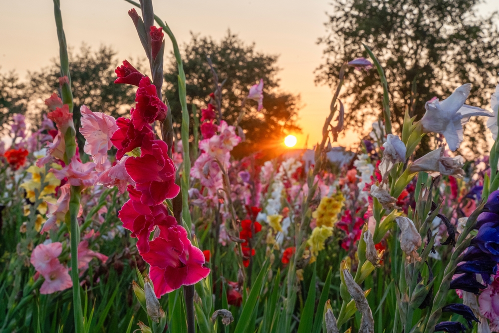 Oltre ai girasoli, nello stesso giardino ci sono i gladioli. Ne vengono coltivati 30mila di 12 specie. Anche questi fiori sono utilizzati a scopo decorativo. I fiori sull’alto fusto sembra che formino una spiga. Si tratta di piante che una volta recise e messe nel vaso, possono durare molto e abbelliscono la casa grazie ai colori, bianco candido, giallo oro, lilla, viola, azzurro e blu intenso.