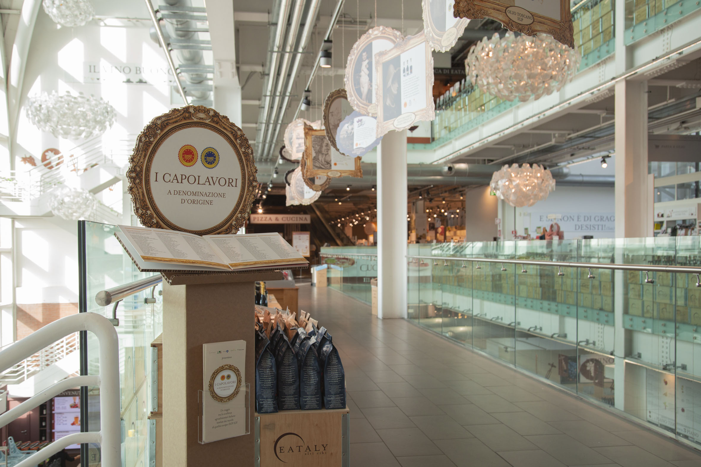Un’opportunità all’interno degli store italiani di Eataly, realizzata attraverso numerosi materiali di comunicazione originali. Il racconto sull’eredità culturale dei prodotti è fruibile grazie a grandi pannelli illustrati, mentre gli aspetti più attuali sulle produzioni sono affidati a un “manuale” contenente l’elenco aggiornato delle denominazioni italiane, a una brochure dedicata all’approfondimento sulle produzioni di qualità europee e sul significato dei marchi DOP IGP e a etichette dotate di QR-code presenti sugli scaffali che accolgono i prodotti DOP IGP. Un percorso divulgativo che va dalle caratteristiche organolettiche dei prodotti, agli elementi di tracciabilità e sicurezza alimentare, fino a toccare alcuni di quegli elementi storici e culturali a cui prodotti agroalimentari e vitivinicoli si sono legati nel tempo: monumenti, opere letterarie, personaggi storici, caratteristiche dell’ambiente e del territorio. Attraverso la galleria esposta tra gli scaffali di Eataly, i consumatori sono accompagnati con immagini e testi, alla scoperta del “DNA culturale” delle Indicazioni Geografiche italiane.