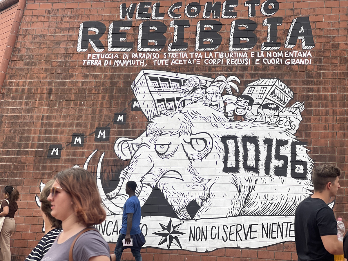 Situato nel piazzale della Metro Rebibbia, il murale è stato realizzato nel 2014 da Zerocalcare nell’ambito della collaborazione tra ATAC e AIE Associazione Italiana Editori con la curatela di 999 Contemporary. L’occasione era la XIII edizione della Fiera Nazionale della piccola e media editoria Più Libri Più liberi. Ora, l’opera è stata restaurata con pitture ecosostenibili che trasformano gli agenti inquinanti (ossidi di azoto e zolfo, benzene, formaldeide e monossido di carbonio) in molecole di sale.