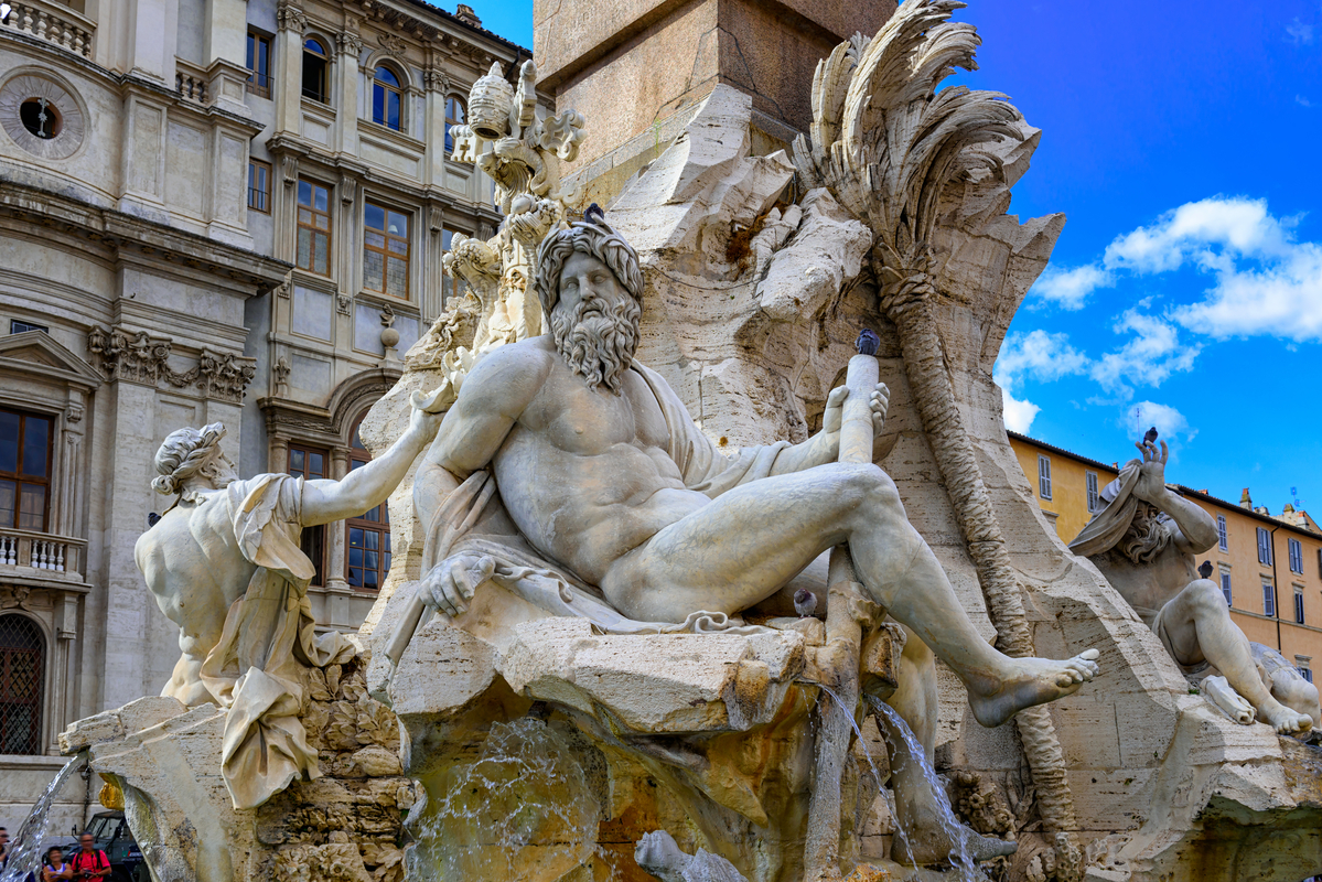 I nudi, in particolare, rappresentano le allegorie del Nilo, del Gange, del Danubio e del Rio de la Plata e sono risalenti all’antico. Queste figure esprimono una vitalità e un’esuberanza espressiva straordinarie. La statua del Danubio punta verso uno degli stemmi dei Pamphili sul monumento, simboleggiando il dominio universale del Papa. Il Nilo, invece, si copre il volto con un drappo, alludendo al mistero delle sue sorgenti, che rimasero sconosciute fino alla fine del XIX secolo. Il Rio della Plata è rappresentato con un sacco pieno di monete d’argento, evocando il colore argenteo delle sue acque. Infine, il Gange è raffigurato con un lungo remo, indicando la sua navigabilità.