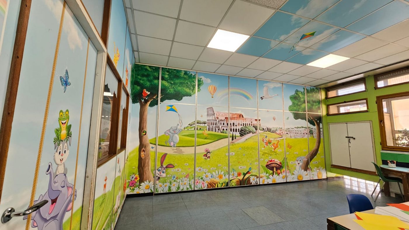 Silvio Irilli, fondatore di Ospedali Dipinti, ha trasformato Emma in un dolcissimo cartoon ambientato in un giardino che si affaccia su monumenti come il Colosseo, i Fori Imperiali, la cupola di San Pietro. La bambina sarà accompagnata da altri personaggi e supporterà le attività didattiche che si svolgeranno nella sala.