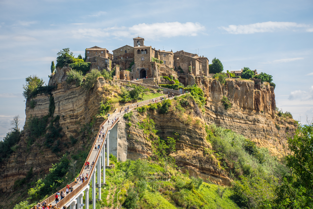 - Civita di Bagnoregio, da tutti conosciuta come “la città che muore”. Borgo sospeso nel tempo, è unito alla terra ferma attraverso un viadotto di 300 metri che si percorre soltanto a piedi.