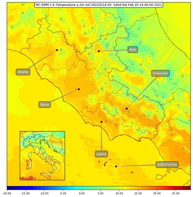 L’aumento termico si farà più marcato tra sabato 20 e domenica 21 febbraio con le temperature superficiali nel Lazio che potrebbero superare localmente i 18-20°C.