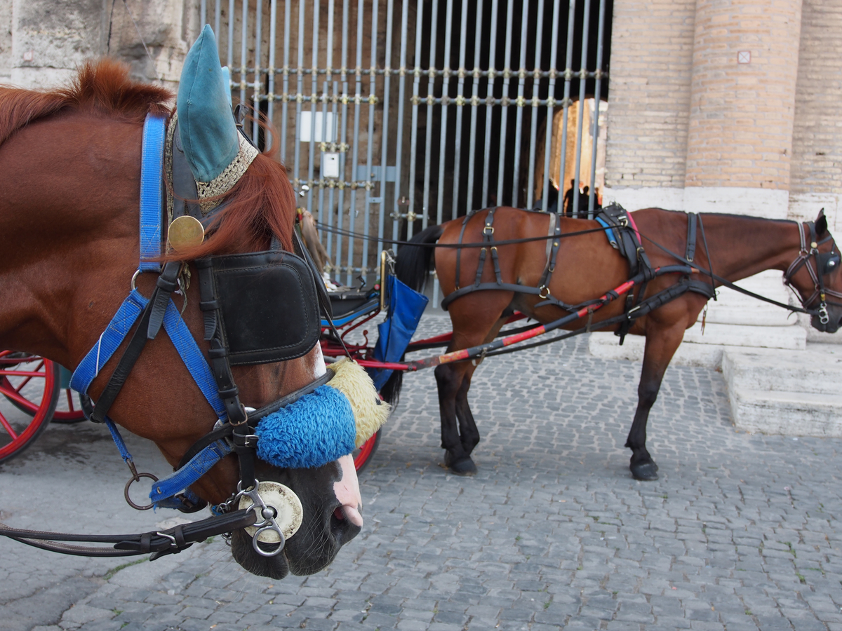 i cavalli sono ancora sotto il sole sull’asfalto e sanpietrini bollenti,in più devono portare con le loro forze peso di certi ciccioni disumani per Roma!