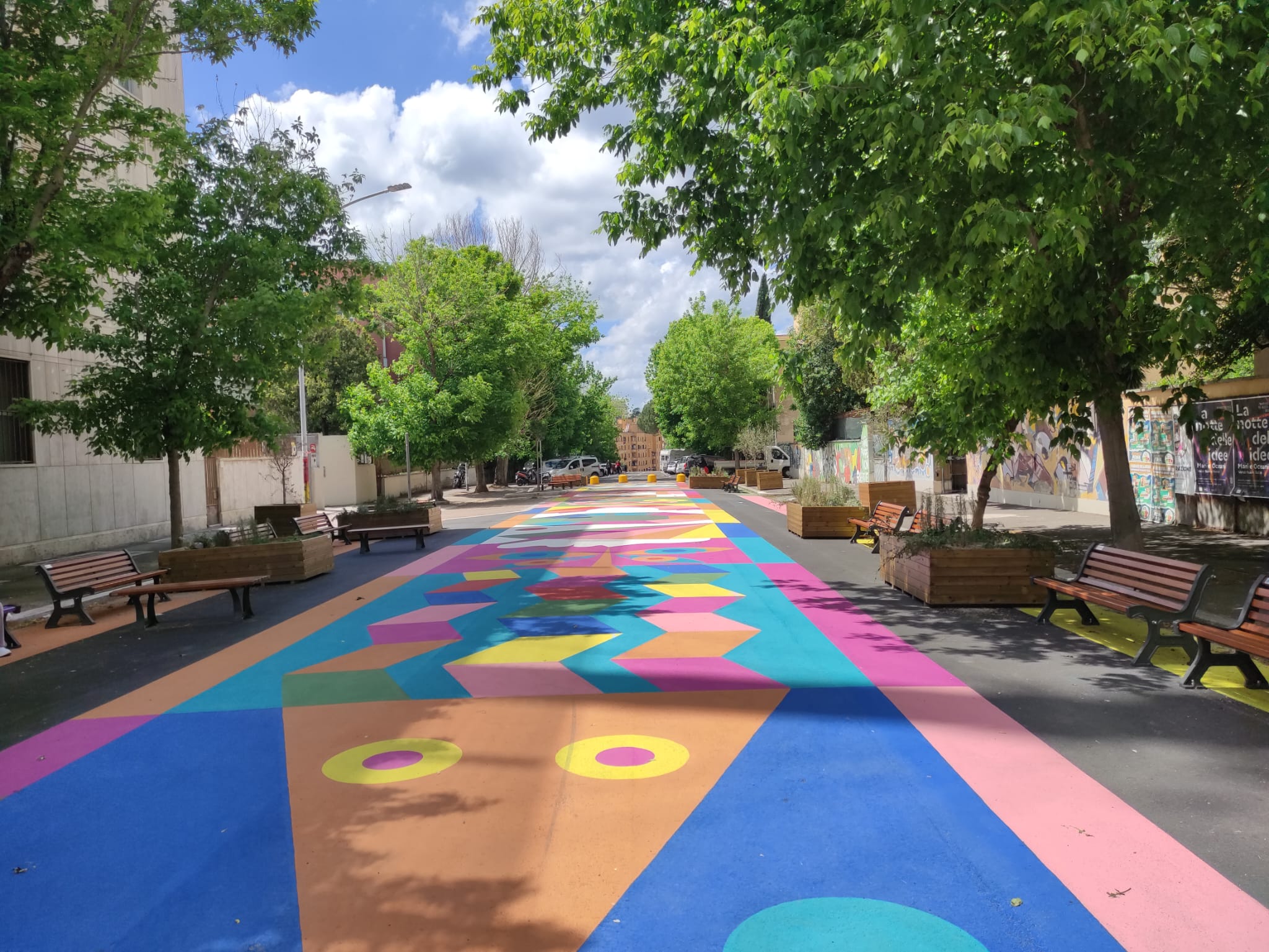 Tutte le strade portano a Roma, ma non tutte le strade sono semplici collegamenti tra due punti: ce n’è una in particolare che non è solo da attraversare, ma da vivere in un percorso tra asfalto colorato e un’esperienza unica. Nascosta tra le geometrie residenziali del Tufello, si snoda come una macchia caleidoscopica in mezzo al traffico cittadino. Qui le automobili si fermano, e al loro posto si muovono piedi, bici, pattini e risate di bambini. Non si tratta di una festa temporanea o di un’installazione effimera, ma di un nuovo modo di immaginare lo spazio urbano.