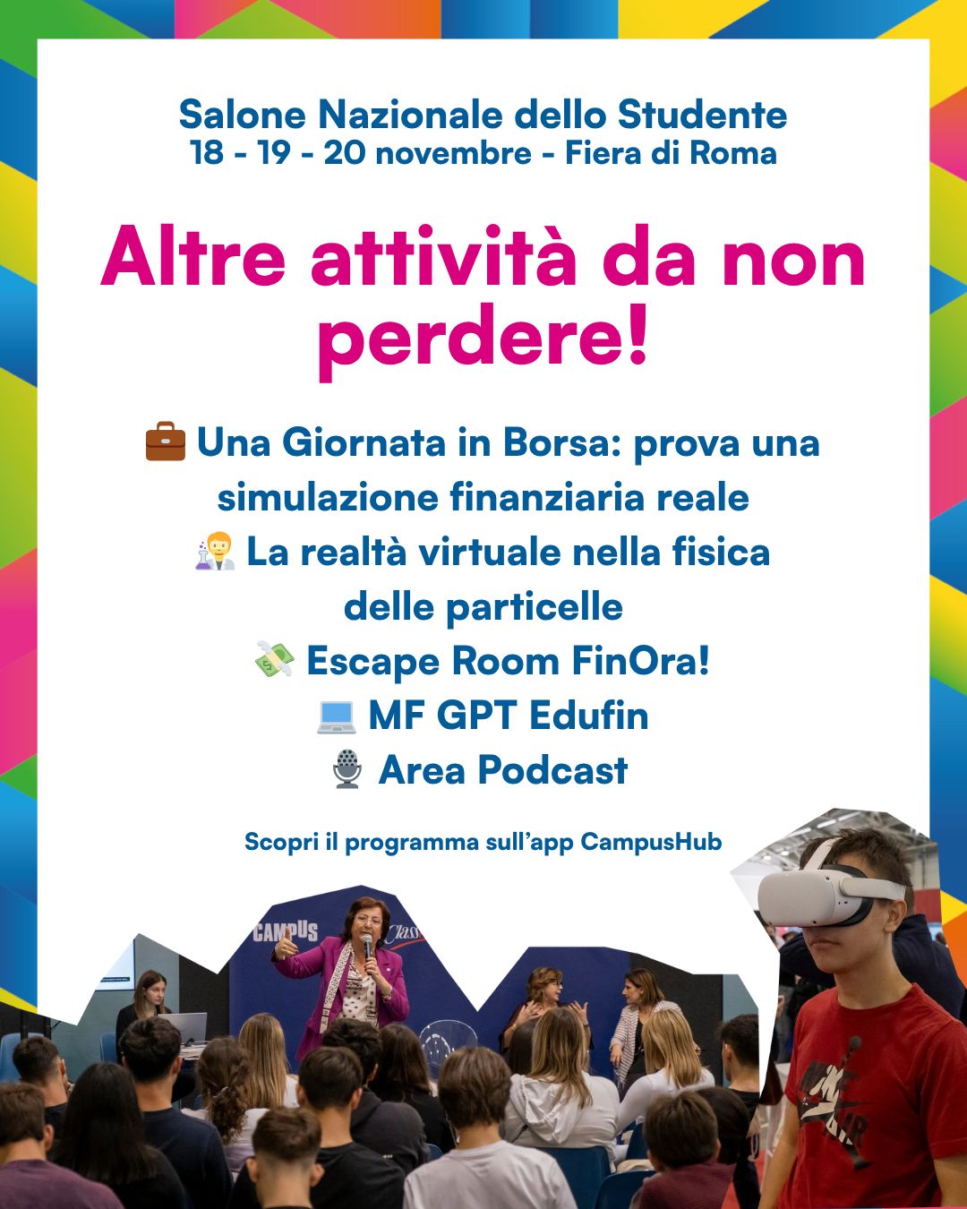 Si è aperta il 18 Novembre alla Fiera di Roma la quarta edizione del Salone Nazionale dello Studente e dell’Educazione Finanziaria, l’appuntamento di riferimento per l’orientamento post-diploma dedicato alle scuole di tutta Italia e organizzato da Campus. La manifestazione, che nel capoluogo romano ha una storia trentennale – la prima edizione risale al 1991 – si conferma anche quest’anno come la più importante kermesse nazionale dedicata al futuro formativo dei giovani.