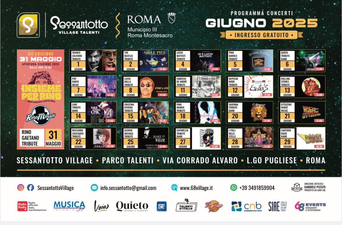 Roma si accende anche questa estate con il Sessantotto Village 2025, il villaggio estivo che anima il cuore di Parco Talenti con musica, spettacoli, buon cibo e tanto divertimento, fino al 28 agosto. Due mesi e mezzo di eventi completamente gratuiti, per vivere l’estate romana all’aperto, tra amici, musica e allegria.