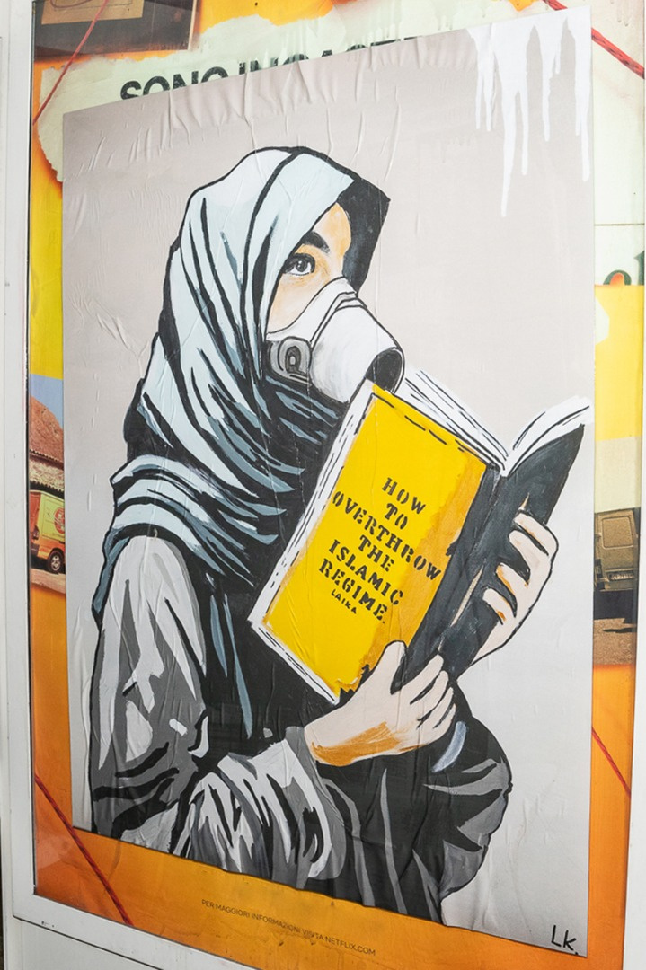 In via Nomentana (all’altezza della Basilica di Sant’Agnese fuori le Mura), nei pressi dell’Ambasciata Iraniana, è apparsa, nella notte tra il 9 e il 10 marzo, la nuova opera della Street Artist Laika, dal titolo “Poisoned by the Islamic Regime”.