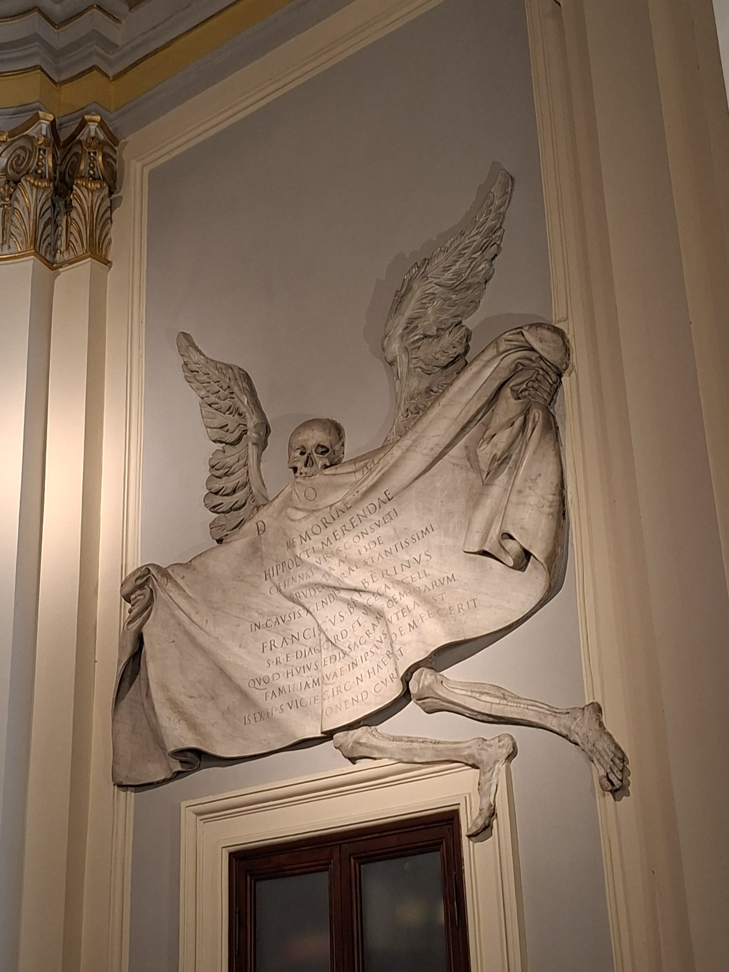 Accanto a questo dipinto si trova però l’opera che più colpisce i visitatori: la Memoria funebre di Ippolito Merenda, realizzata da Gian Lorenzo Bernini. Si tratta di un monumento funebre decisamente insolito: una grande lastra marmorea che sembra un lenzuolo mosso dal vento, sostenuta da uno scheletro alato che emerge dalla parete. L’effetto è potente e quasi teatrale, perfettamente in linea con il linguaggio barocco di Bernini, ma al tempo stesso sorprendentemente macabro.