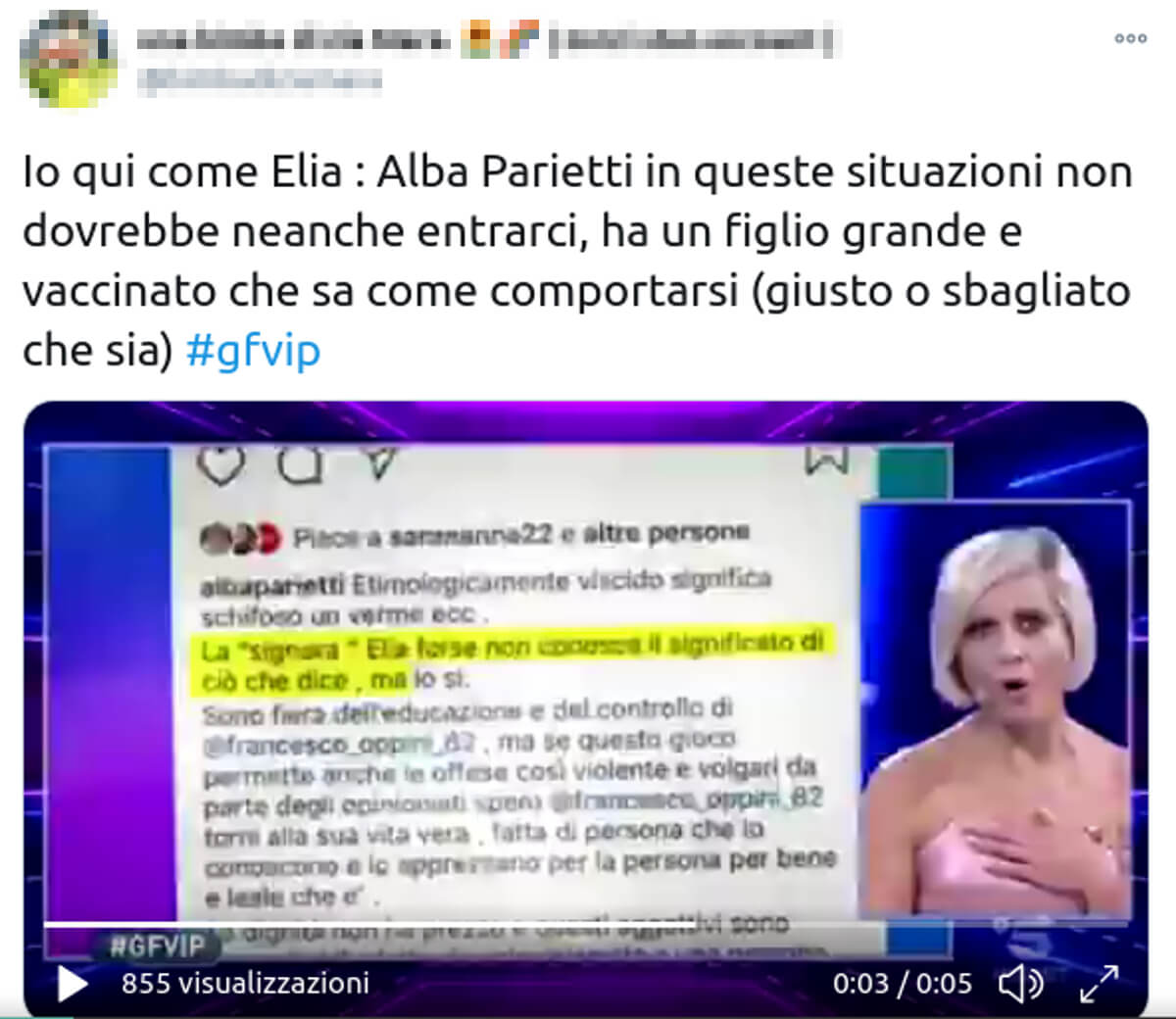 Andiamo con ordine. Alba Parietti non è certo morbida con Antonella Elia, specie dopo che quest’ultima aveva definito il figlio Francesco “viscido e para..lo”. A riguardo, la Parietti ha scritto su Instagram una Stories nel quale esordiva con “Etimologicamente viscido significa schifoso, un verme, ecc… La ‘signora’ Elia forse non conosce il significato di ciò che dice, ma io sì”.