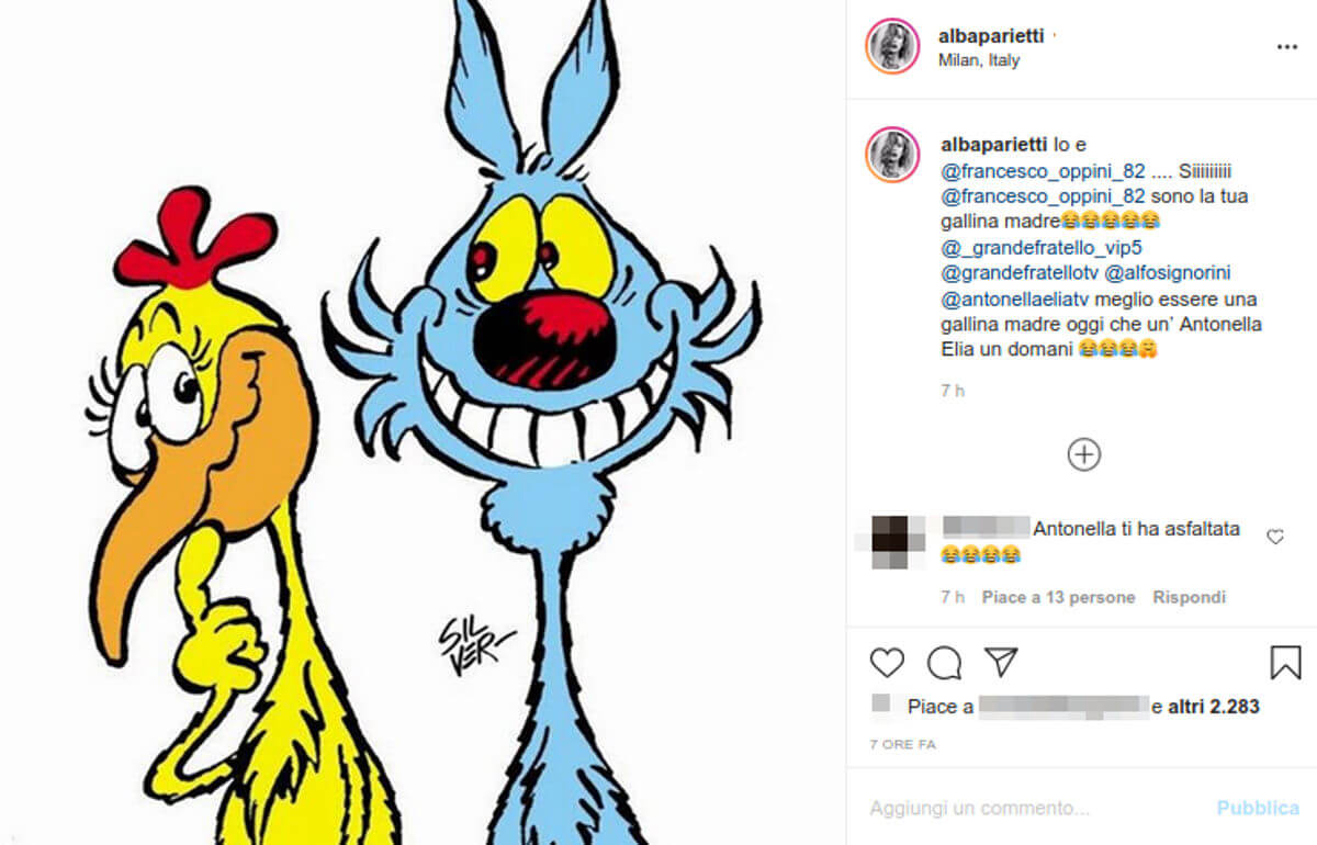 Un commento piccato che ha subito scatenato la reazione di Alba, che dopo la puntata ha pubblicato su Instagram un post proprio sulla questione, nel quale ha voluto inserire i personaggi di Lupo Alberto e della gallina Marta.