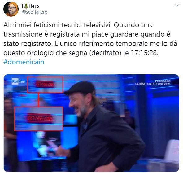 “Altri miei feticismi tecnici televisivi. Quando una trasmissione è registrata mi piace guardare quando è stato registrato. L’unico riferimento temporale me lo dà questo orologio che segna (decifrato) le 17:15:28” ha scritto una settimana fa su Twitter un blogger mostrando un fotogramma della trasmissione.