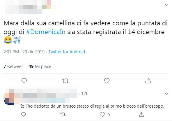 “Anche se registrata è stata la più brutta Domenica In del 2019” cinguetta un altro utente, cui fa eco un altro telespettatore: “Infatti! Più di 3 ore dedicate all’oroscopo anche no! Grazie”.