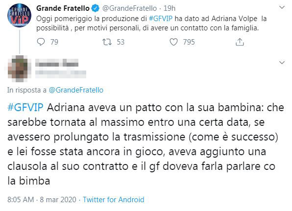“Adriana aveva un patto con la sua bambina: che sarebbe tornata al massimo entro una certa data. Se avessero prolungato la trasmissione (come è successo) e lei fosse stata ancora in gioco, aveva aggiunto una clausola al suo contratto e il GF doveva farla parlare con la bimba”.