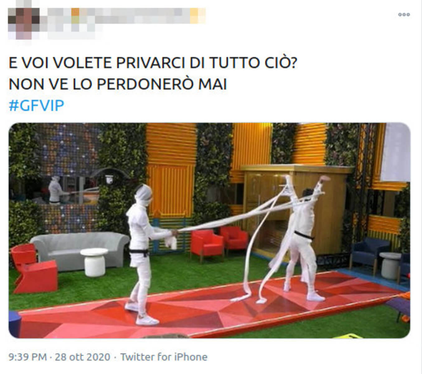 Insomma, un clima di scherzi che ha reso la serata del GF Vip alquanto movimentata, specie se si pensa che era iniziata in maniera un po’ troppo “fasciata”. Come? Diciamo che verso le 21 i coinquilini si erano lasciati andare ad un gioco a tema Halloween organizzando una sfilata di mummie!
