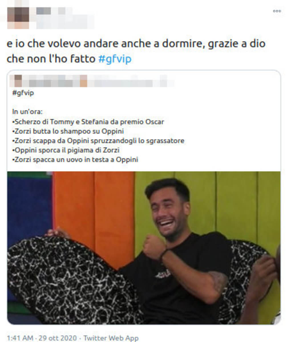 Insomma, scherzo riuscito che ha fatto in modo di risvegliare tutta la casa dando il via ad una serata epica. E già, perché Tommy da quel momento non è stato fermo un attimo, dando il via ad uno scontro all’ultimo sangue con Francesco Oppini.