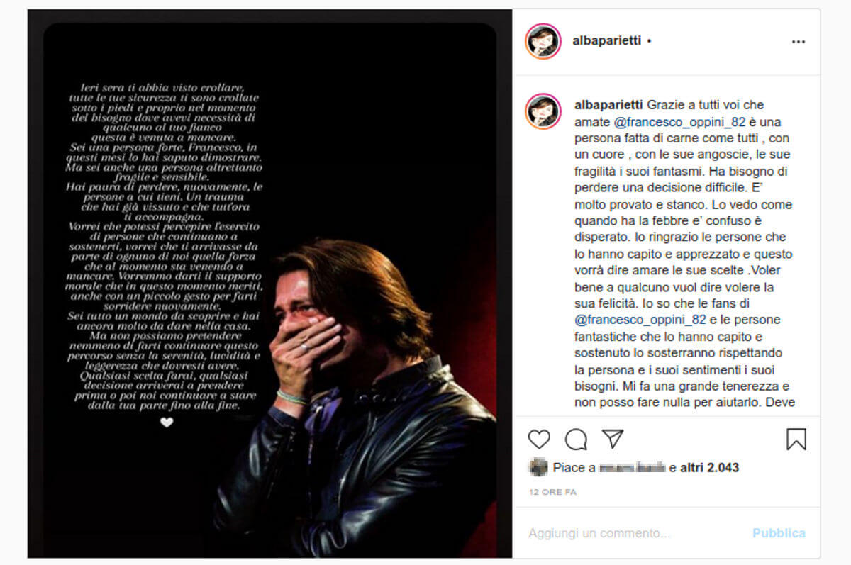 Partiamo dal principio, Alba Parietti ha scritto un lungo post nel quale parla appunto di Francesco Oppini e delle sue incertezze: non è infatti un segreto che, dopo l’annuncio dell’allungamento del programma, il concorrente stia pensando di abbandonare la casa.