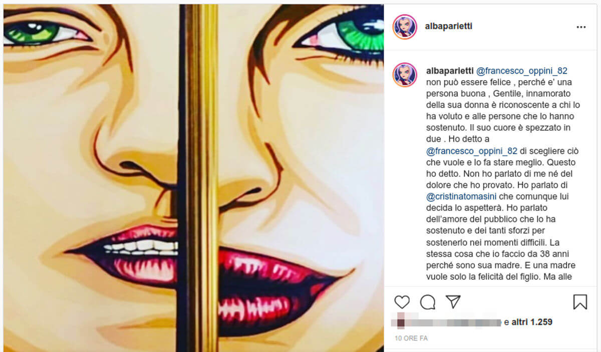 Poi, Alba Parietti è entrata nel dettaglio su quello che lei e Oppini si sono detti in confessionale: “Ho detto a Francesco di scegliere ciò che vuole e lo fa stare meglio. Questo ho detto. Non ho parlato di me né del dolore che ho provato. Ho parlato di Cristina, che comunque lui decida lo aspetterà. Ho parlato dell’amore del pubblico che lo ha sostenuto e dei tanti sforzi per sostenerlo nei momenti difficili. La stessa cosa che io faccio da 38 anni perché sono sua madre. E una madre vuole solo la felicità del figlio. Ma alle volte la felicità significa scontentare o far soffrire qualcuno”.