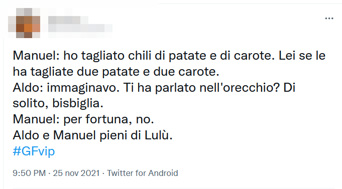 Manuel, in particolare, ha rivelato ad Aldo Montano di aver “tagliato chili di patate e carote” mentre “Lulù, se le ha tagliate, ha tagliato due patate e due carote”.