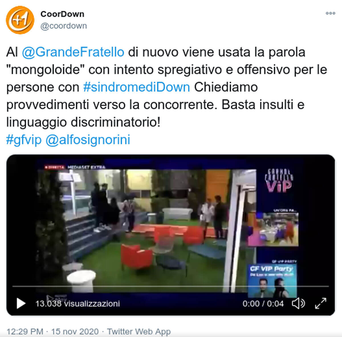“Al Grande Fratello di nuovo viene usata la parola ‘mongoloide’ con intento spregiativo e offensivo per le persone con sindrome di Down – ha scritto CoorDown in un tweet – Chiediamo provvedimenti verso la concorrente. Basta insulti e linguaggio discriminatorio!”