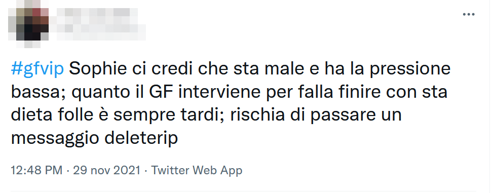 Ma se in tanti si sono chiesti preoccupati come sta Sophie Codegoni adesso, molti altri hanno fatto delle ipotesi sui motivi delle sue condizioni di salute. E molti cinguettatori di Twitter hanno concluso che dietro l’abbassamento di pressione delle concorrente ci sia essenzialmente il fatto che stia seguendo una rigida dieta che la sta portando a mangiare davvero molto poco.