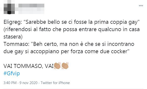 “Secondo me entra qualcuno per te” ha esclamato Francesco Oppini, ipotizzando l’ingresso di un concorrente gay nella casa del GF Vip. La conduttrice di Battiti Live ha aggiunto: “Sarebbe bello se ci fosse la prima coppia gay”. Una frase che non è piaciuta al buon Tommaso che ha prontamente replicato: “Beh certo, ma non è che se si incontrano due gay si accoppiano per forza come due cocker”.
