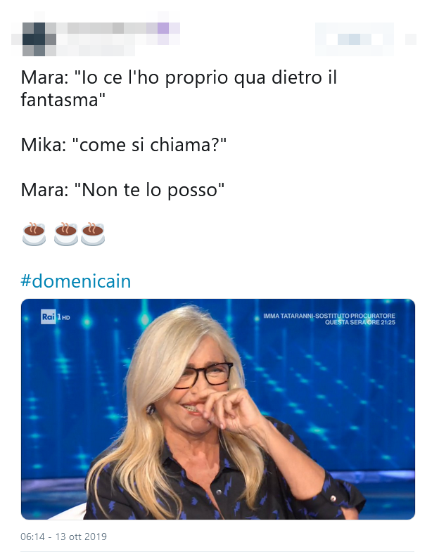 “Tranquillo – ha esordito Mara Venier – qui qualcuno ce la tira, non ti preoccupare, io ho un fantasma proprio qui dietro”. A quel punto, il buon Mika ha chiesto “Sì, come si chiama?”, ottenendo in risposta un secco “Non te lo posso dire…”