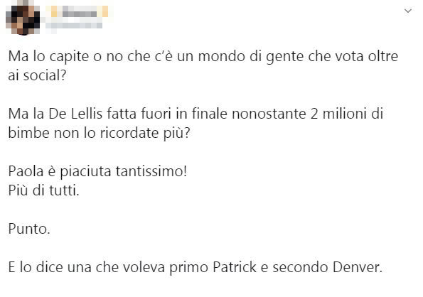“Ma lo capite o no che c’è un mondo di gente che vota oltre ai social? Ma la De Lellis fatta fuori in finale nonostante 2 milioni di bimbe non lo ricordate più? Paola è piaciuta tantissimo! Più di tutti. Punto. E lo dice una che voleva primo Patrick e secondo Denver”