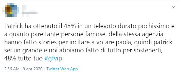 “Patrick ha ottenuto il 48% in un televoto durato pochissimo e a quanto pare tante persone famose, della stessa agenzia hanno fatto stories per incitare a votare paola, quindi Patrick sei un grande e noi abbiamo fatto di tutto per sostenerti, 48% tutto tuo”.