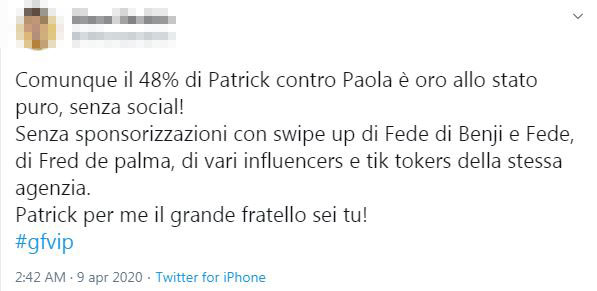 “Comunque il 48% di Patrick contro Paola è oro allo stato puro, senza social! Senza sponsorizzazioni con swipe up di Fede di Benji e Fede, di Fred de palma, di vari influencers e tik tokers della stessa agenzia. Patrick per me il grande fratello sei tu!”
