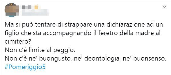 Ma si può tentare di strappare una dichiarazione ad un figlio che sta accompagnando il feretro della madre al cimitero? Non c’è limite al peggio. Non c’è né buongusto, né deontologia, né buonsenso” osserva un telespettatore su Twitter.
