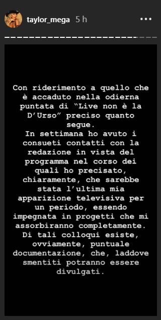 Subito dopo la partecipazione a Live, Taylor Mega ha pubblicato un video molto duro contro Barbara D’Urso nelle IG Stories, scagliandosi anche contro gli autori dello show.