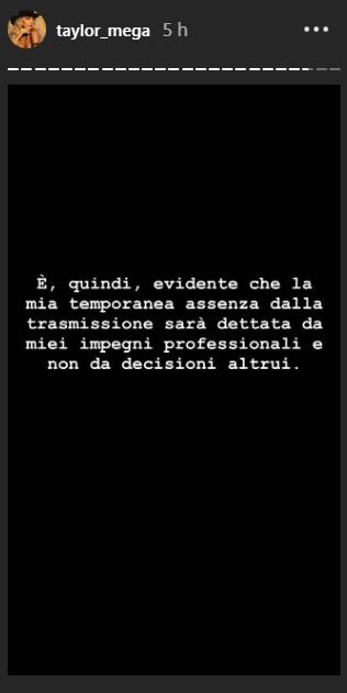 “E’ un mese che mi rompono il ca**o di andare in tv a parlare, quando io non ci voglio andare perché sto lavorando su altri progetti, ok? Oggi mi chiamano e mi dicono: ‘Vieni, per cortesia, vieni. Fai la dichiarazione che per un po’ non vai in tv perché ti stai impegnando su altri progetti’. Io dico: ‘Ok, ci vado, ci vado solo per spiegare questa cosa’. Mi incominciano a mettere in mezzo ad altri talk in cui io non posso non parlare, perché si parla di violenza di genere, e quindi io devo dire per forza la mia e poi la presentatrice mi viene a dire: ‘No Taylor, non ti chiamiamo per un po’ in tv perché tu hai fatto quest’azione’.