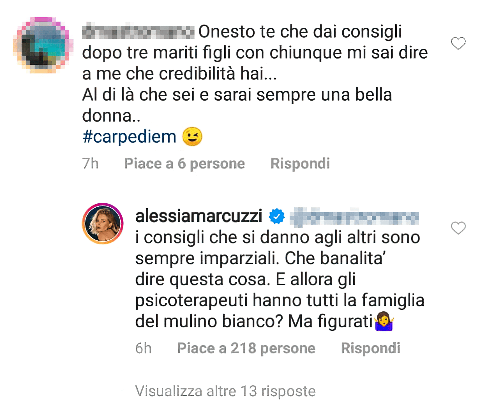 A qualcuno però non sono piaciuti molto i consigli che Alessia Marcuzzi dispensa alle coppie di Temptation Island, tanto che l’ha attaccata direttamente su Instagram sulla questione: “Onesto te che dai consigli dopo tre mariti, figli con chiunque. Mi sai dire a me che credibilità hai? Al di là che sei e sarai sempre una bella donna”.