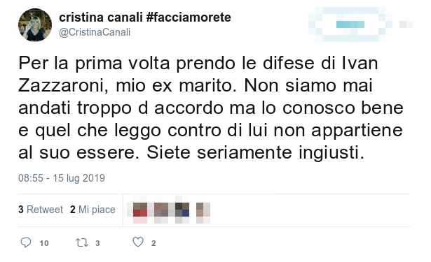 A prendere la parola è invece Cristina Canali, ex moglie del giornalista, che su Twitter spezza una lancia proprio in favore di Zazzaroni.
