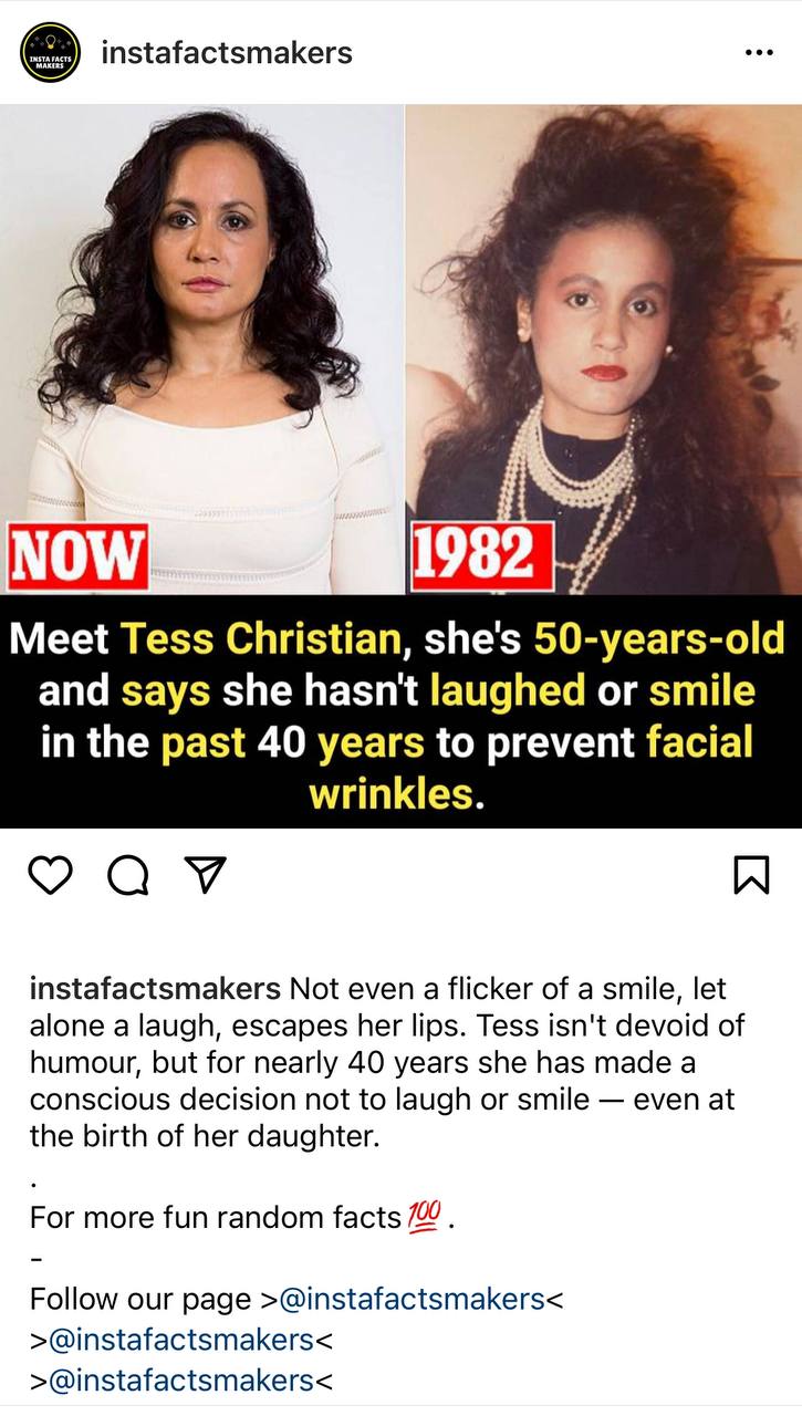 Da 40 anni Tess non accenna un sorriso né con amici, né in privato, perché vuole mantenere la sua pelle liscia e senza arricciature dovute alle espressioni facciali che assumiamo quando ridiamo o al contrario mettiamo il broncio.